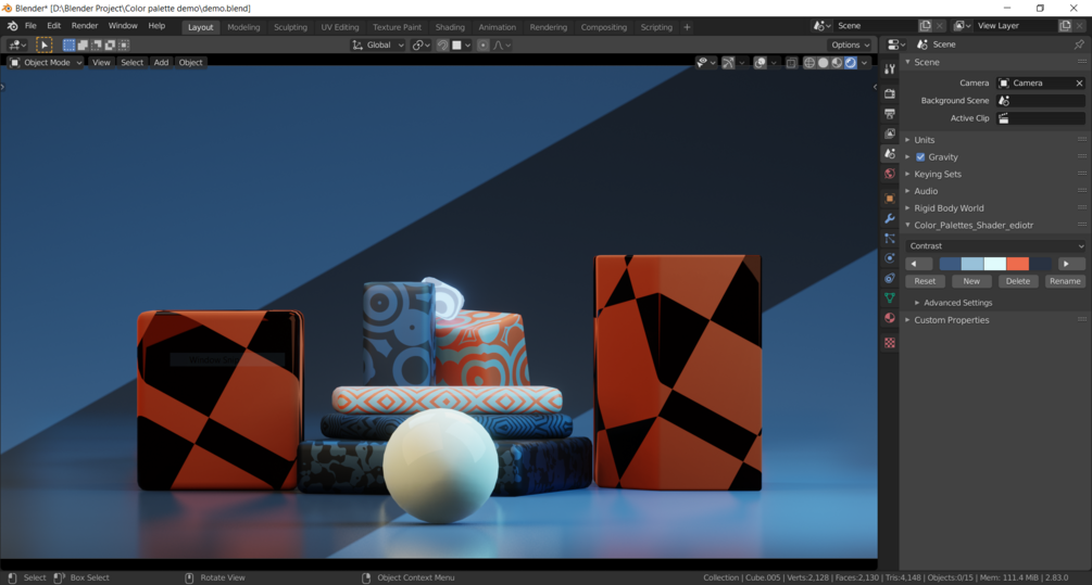 This add-on let's you quickly customize the color of different materials at once. You can just scroll through the different color palettes to see how your scene looks.